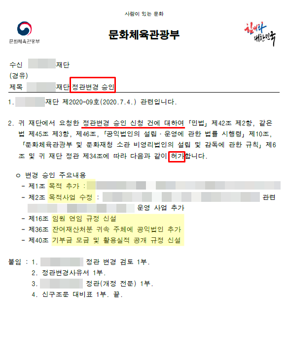 사단법인 설립 후 운영을 하다 보면 사단법인 정관을 변경해야 하는 경우도 종종 발생합니다.특히 기부금 수령을 위해서 공익법인(지정기부금 단체) 지정 신청을 위해서 지정 요건을 충족시키기 위해서 정관 변경을 해야 하는 경우도 있습니다.이처럼 사단법인 정관 변경을 위해서는 먼저 총회를 개최하고 의결해야 합니다.사단법인의 경우 총 사원 3분의 2 이상의 동의가 있는 경우에 한하여 정관 변경이 가능합니다.다만, 정관에 정수에 관한 다른 규정이 있는 경우에는 그 규정에 따라야 합니다.사단 법인 정관 변경은 사원 총회의 전권 사항입니다.이에 정관에서 총회의 결의에 따르지 않는 정관 변경은 무효가 됩니다.그러므로 반드시 총회를 개최하고 의사록을 작성해야 합니다.총회를 통해서 정관 변경을 의결한 뒤에는 주무 관청의 인가를 받아야 합니다.다만 정관의 본문이 아닌 부칙, 보칙 등에 있는 발기인, 임원진의 인적 사항 등에 대해서는 주무 관청의 인가를 필요로 하지 않습니다.그러므로 사단 법인의 임원이 변경된 때도 정관 변경 절차 없이 사단 법인 정관 변경이 가능합니다.(단 사단 법인 정관에 임원 선임에 대해서 주무 관청의 승낙을 조건으로 하는 조항이 있으면 주무 관청의 인가가 필요하겠죠.). 임원의 변경을 제외하고 주사무소를 이전하거나 분 사무소 설치, 사단 법인의 설 릭 목적 사업 내용, 기본 재산 목록, 사단 법인의 명칭, 자산의 종류에 대해서 변경이 있을 경우에는 총회 의결, 주무 관청의 허가 등 정관 변경 절차가 필요합니다.그러므로 사단 법인 정관에 주사무소 소재지가 지역으로 기재된 것이 아니라 정확한 주소에서 나오는 경우 사무실을 이전하게 되면 총회에서 주무 관청 인가까지 정관 변경 절차를 거쳐야 합니다.주무 관청의 인가를 받고, 정관 변경 허가증을 발급된 날로부터 3주 이내에 변경된 정관에 대해서 등기를 해야 합니다.위에서 말씀드린 임원의 변경과 같이 주무관청의 인가를 받지 않는 경우라도 민법에 따라 등기는 필요합니다.사단법인 설립 절차는 아래 글에 자세히 기재되어 있으니 사단법인 설립을 고려하시면 꼭 한번 읽어보시기 바랍니다^^▼사단법인 설립시 절차와 필요서류 안녕하세요. 박재현 행정사입니다 ^^ 오늘은 비영리법인 중 사단법인 설립에 대해 설명하고자 합니다. 사…blog.naver.com사단법인 설립시 절차와 필요서류 안녕하세요. 박재현 행정사입니다 ^^ 오늘은 비영리법인 중 사단법인 설립에 대해 설명하고자 합니다. 사…blog.naver.com하나행정사가맹거래사사무소 서울특별시 마포구 토정로18길 11단지내 상가 B2동 109호하나행정사가맹거래사사무소 서울특별시 마포구 토정로18길 11단지내 상가 B2동 109호하나행정사가맹거래사사무소 서울특별시 마포구 토정로18길 11단지내 상가 B2동 109호